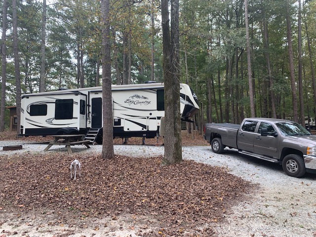 Today we traveled 180 miles to Croft State park here in Spartanburg SC. The trip was filled with heavy traffic(everybody and there brother were out driving) and construction along the way, the Rv took a little beating, it was not a fun drive. I am a little tired and worn down. We stay here till Sunday when we leave for Georgia. The rain also has caught up with us, most likely Saturday and Sunday it will be raining. That’s, I guess Ok, we are not sightseeing here. Picture below is of our site here.