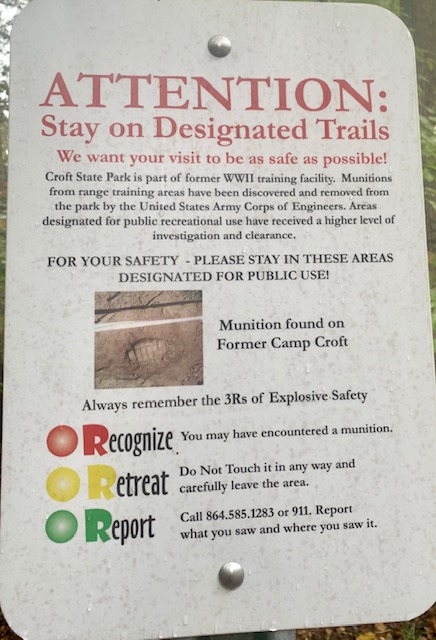 Now for some history on the park which was first named Camp Croft. Built on 9000 acres back in 1939, it was a army training camp. In all 250,000 men were trained here during the war. 16,000 came in at a time and They trained in everything you could think of, in there 16 weeks of training. Then shipped off to the war, mostly Europe or the pacific. After the war, 7000 acres were sold to the state to make the park, and 2000 remain as camp Croft recreation area. All over the place and on all the trails you see signs, not beware of bears, but beware of live explosives. As a training site everything from hand grenades, bazooka rounds, anti tank rounds, artillery rounds were used here, lots did not go off. They are all over and they tell you that. Be neat to find a grenade!!!!. WHY didn’t we notice this last time we were here, HUH
