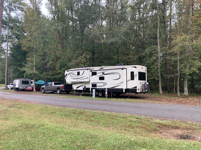 We are now near Macon Georgia, at High Falls State Park, we have been here before. We left earlier this morning than we usually do, mostly because we were awake early, it rained all night and hard at times, remints of Delta. However when we got up it stopped and we were able to hitch up and leave. The site we had has a tight bend when you leave and downhill, boy did the 5er moan as i made the turn. It rained on and off all day as we made our way down here. Plus traffic again was bad ,and we hit a traffic jam, right before Atlanta, lasted about an hour ,stop and go. I was frustrated today, people just think they can dart in front of you or tail gate behind. We drove 234 miles today, the most of the trip so far. Tonight i think i will just sit in the recliner and rest, no tv music, nothing. Picture of our spot here below.