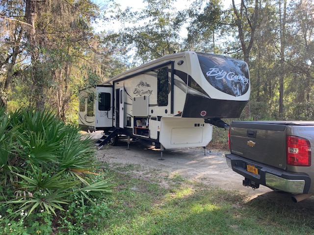 We are now in Florida, all be it at the top, but Florida, land of the live oak trees covered in moss, palm trees, and sunshine. We have been here before and like it. Today we drove 234 miles, it was a good day driving, the four hours seemed to just go by, still traffic, but the roads by far were very good. Here for one night, it’s 84 here and now sunny. We are all doing good, and not much else for now. Picture below is of our spot
