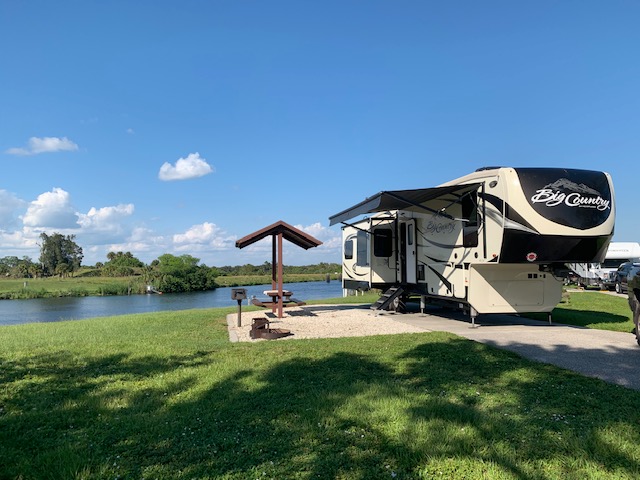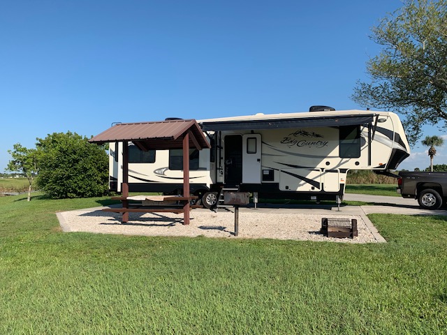 We are now near Fort Myers, staying one night at Ortano Corps of Engineer park. We have been here before, its nice but not near anything. Today we drove 173 miles . Last night we thought it might be best if we just stayed right off interstate 75 in Fort Myers at the Cracker Barrel. This way we would not have to travel east about 35 miles to get here. So that’s what we planned. We got to the Cracker Barrel before 2 pm, and unhitched, then i went and got gas. When i got back i thought what are we going to do all day, plus with no power to the Rv (as it was 90 today) i mention to Melissa lets just go to Ortano. So, while we were already at Cracker Barrel we decide to have a early dinner. We sat outside, which was nice as we could have Cooper with us, (did not want to leave him in the hot truck.) It was nice i had ice tea ,and the trout dinner with fries and green beans, Melissa had water and the chicken pot pie. After that we drove here and set up, glad we did, even though it is a little out of the way. Tomorrow we head to Key Largo. Pictures below of our site.