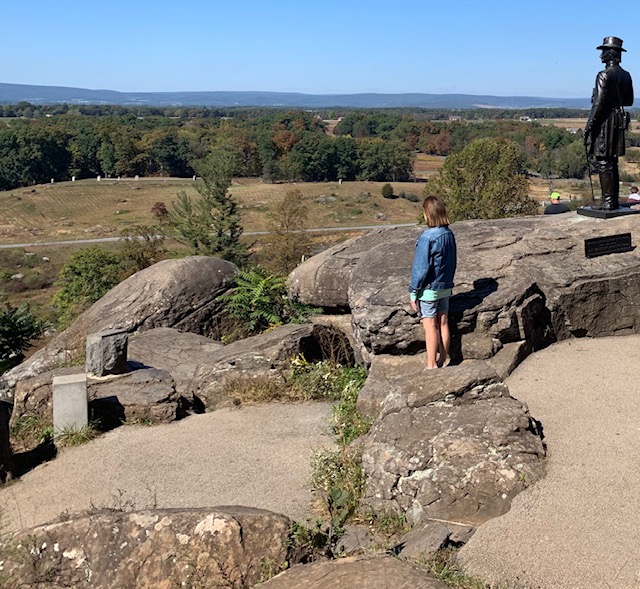 We walked to my dad’s favorite place, Little Round Top, and stood where he used to stand. He stood just like General Warren and looked across the valley to Devil’s Den. I wish I knew wat he was thinking.