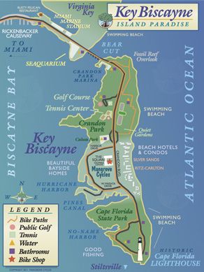Key Biscayne is an island village, four miles long and two miles wide, located south and east of downtown Miami. The village is connected to Miami via the Rickenbacker Causeway. Key Biscayne is home to two miles of beachfront plus two major parks, Crandon Park and Bill Baggs State Park.