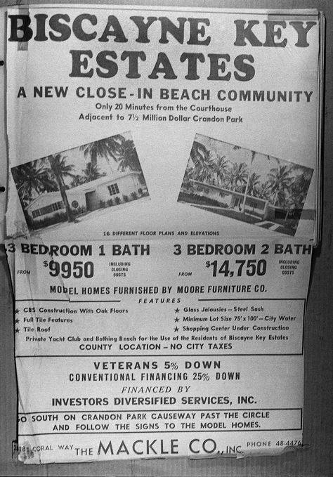 In 1950, the Mackle Company purchased Nan’s southern third of the middle of the Key and built 289 cement block homes targeted to veterans with attractive financing. Also built on the ocean were the Key Biscayne Villas, later to become the Key Biscayne Hotel and Villas. A shopping center was built and land was donated for a school. With great success, the Mackle brothers – Frank, Bob and Elliot – purchased more land and developed more homes up to Heather Drive Even today they make up more than half the single-family houses on the island. The Key Biscayne Hotel opened in 1952. Today the remaining “Mackles” homes are well over a million dollars to purchase.