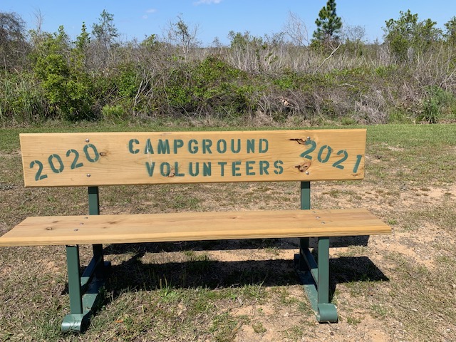 A bench at Gulf Shores for Campground Volunteers for 2020 & 2021. I think that all campgrounds should have a bench like this !
