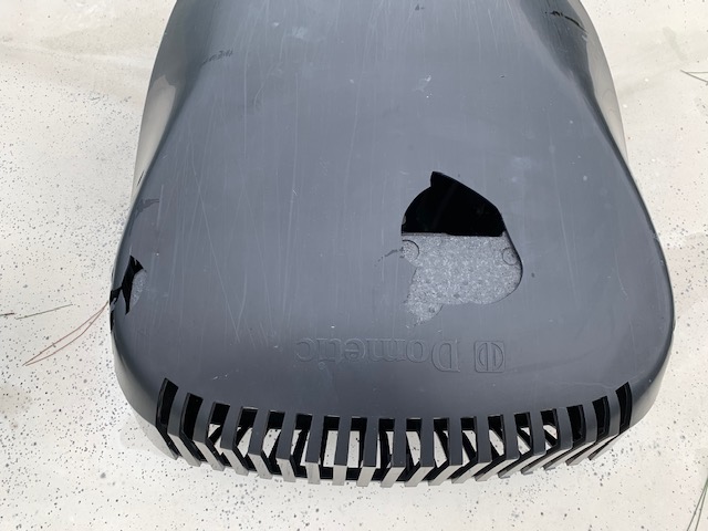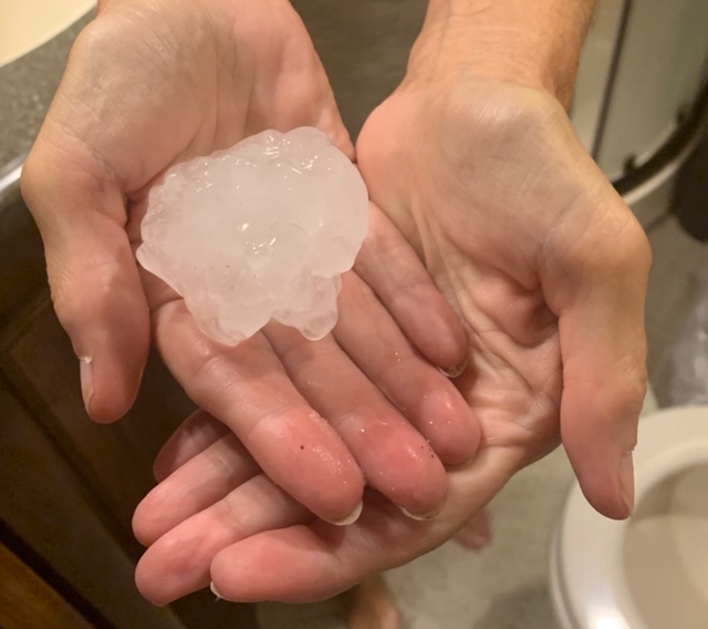 In one fell swoop last night of a half hour. Life has changed. 2:30 am, Saturday night it hit, we got a huge hail storm come in. At first it didn’t seem bad, then it started to get a little scary, sounded like artillery shells hitting the Rv roof, then one crashed through the bathroom vent, landing on the floor. It only lasted not even five minutes, but seemed like a lifetime. The hail stones were baseball size, not little marbles like usual, these were big suckers. When it was over and the rain stopped, i went outside like any other idiot would, and of course went on the RV roof. It was not good, both air conditioner covers had holes in them, the bathroom vent and sky light has holes in them. The worst however was while i was walking on the roof, in places it felt soft, not good. Looking further there were impact craters in the rubber roof. The hail had punched into the plywood decking, but did not put holes in the rubber roof, not any i found yet however. I got a number of towels from Melissa and began stuffing all the holes. More rain coming, two more storm fronts came through with a lot, lot of wind and rain. By eight in the morning it was mostly over.