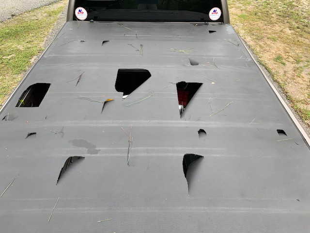 I once again got on the Rv roof. I counted at least 100 impacts of hail on the roof, most over an inch deep, as i looked out over at the truck, my heart sank, the back tonauer cover was full of holes and the hoods of the truck looked like a cratered moon scene. The truck is a mess at least 38 impacts on the hood, not dings but dents. Even the driver side got hit hard, dents all over. By this time people were out, not many of the 400 plus Rv here excaped damage, some cars had to be towed away .