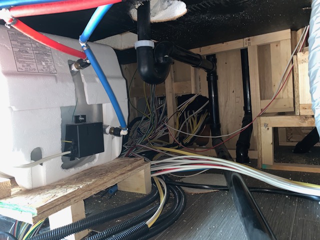 HOT WATER TANK. We now have some hot water. After spending hours in the bay looking for a break in the wires.