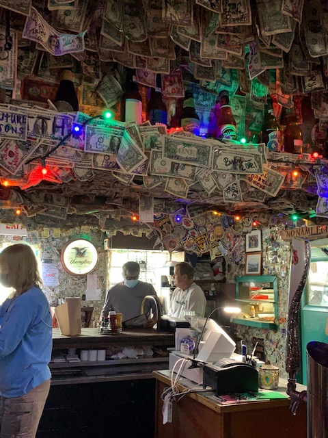 The 1970’s and 80’s became a rowdy time for the pub Jimmy Buffett’s “Why don’t we get drunk and screw” played on the juke box while people would drink, eat and dance to excess in the Pub. There was a lot of illegal money passing through the Keys back then and everyone loved to spend it. They had so much money in fact they started signing the dollar bills hanging it on wall. And this is how it looks today.