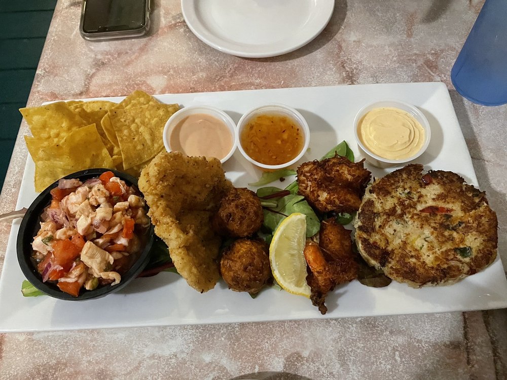 Our friend Lisa, a volunteer that we met “volunteering here 3 years ago at Pennekamp, was here when we first arrived at Pennekamp and the 3 of us went to the Key Largo Conch House for dinner on her birthday. I never ate a conch before, but I wanted to try it. Pronounced “konk”, it is the meat from an oversized sea snail. It is native to the coasts of the Bahamas, Florida Keys, the Caribbean and Bermuda. It’s eaten raw or cooked.