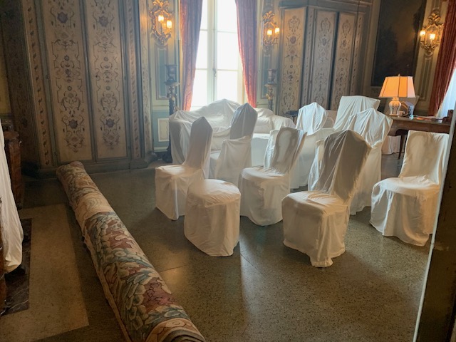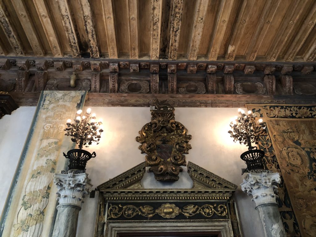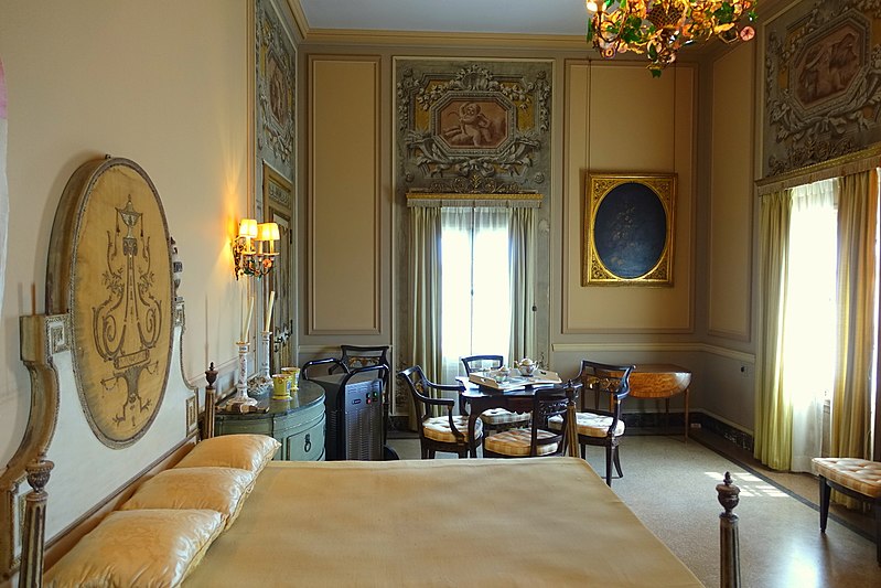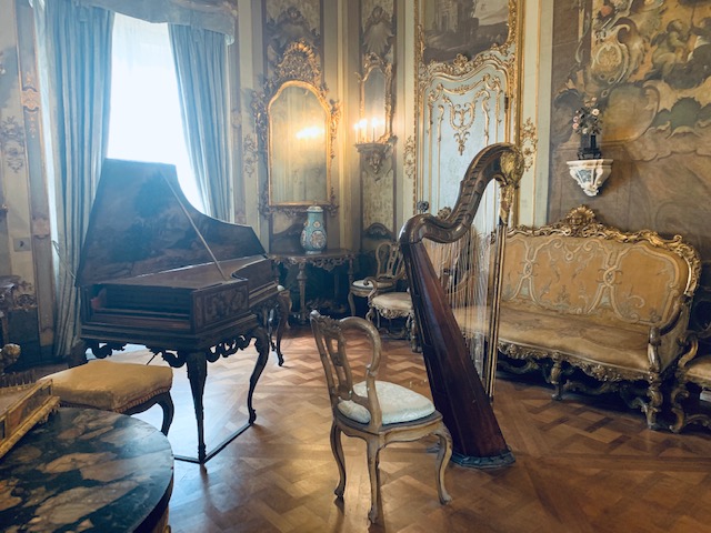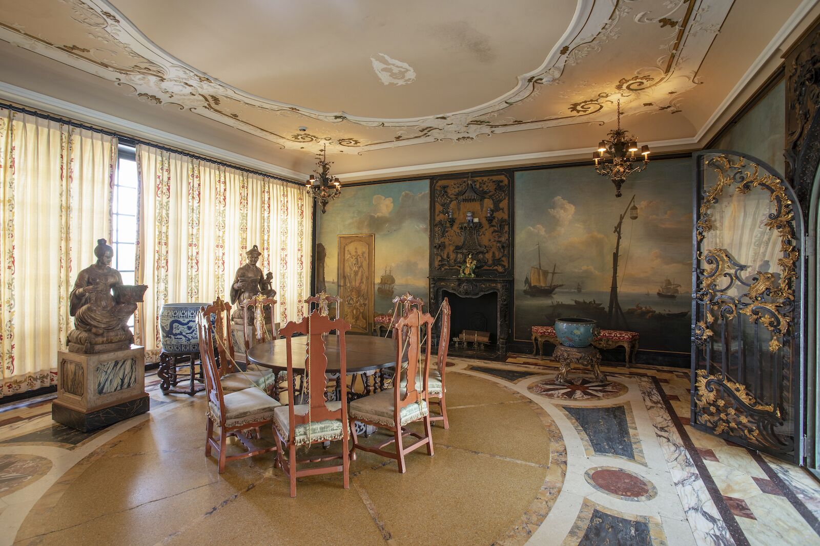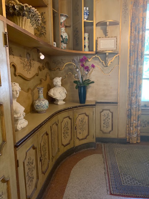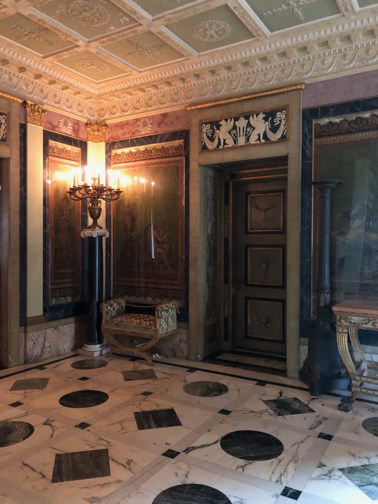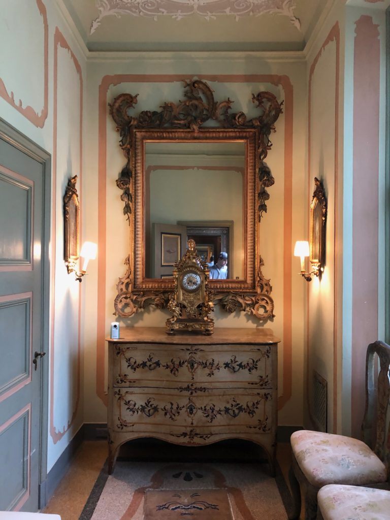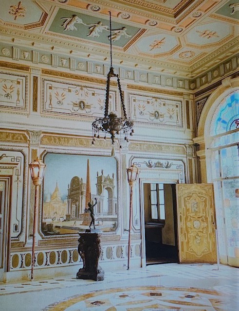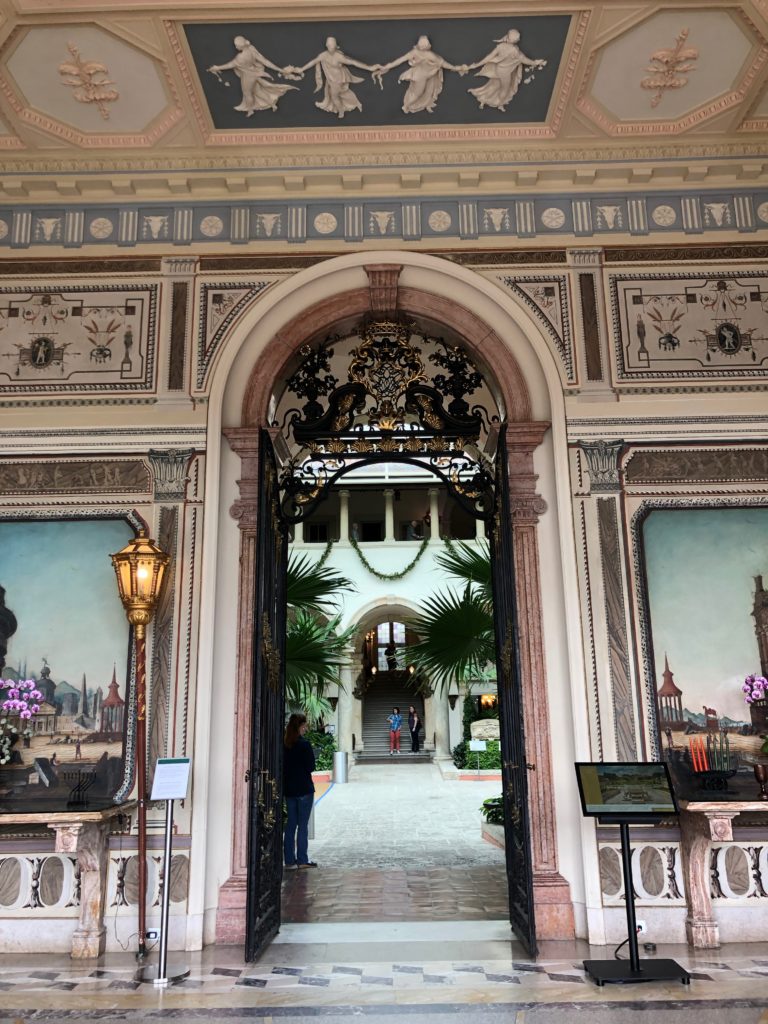 Enclosed Terrace/Loggia is another room that combines so many different patterns, painted surfaces, and materials to a great effect. the 18th-century gilded iron gates that lead to the South Arcade are originally from the Pisani family palace in Venice.