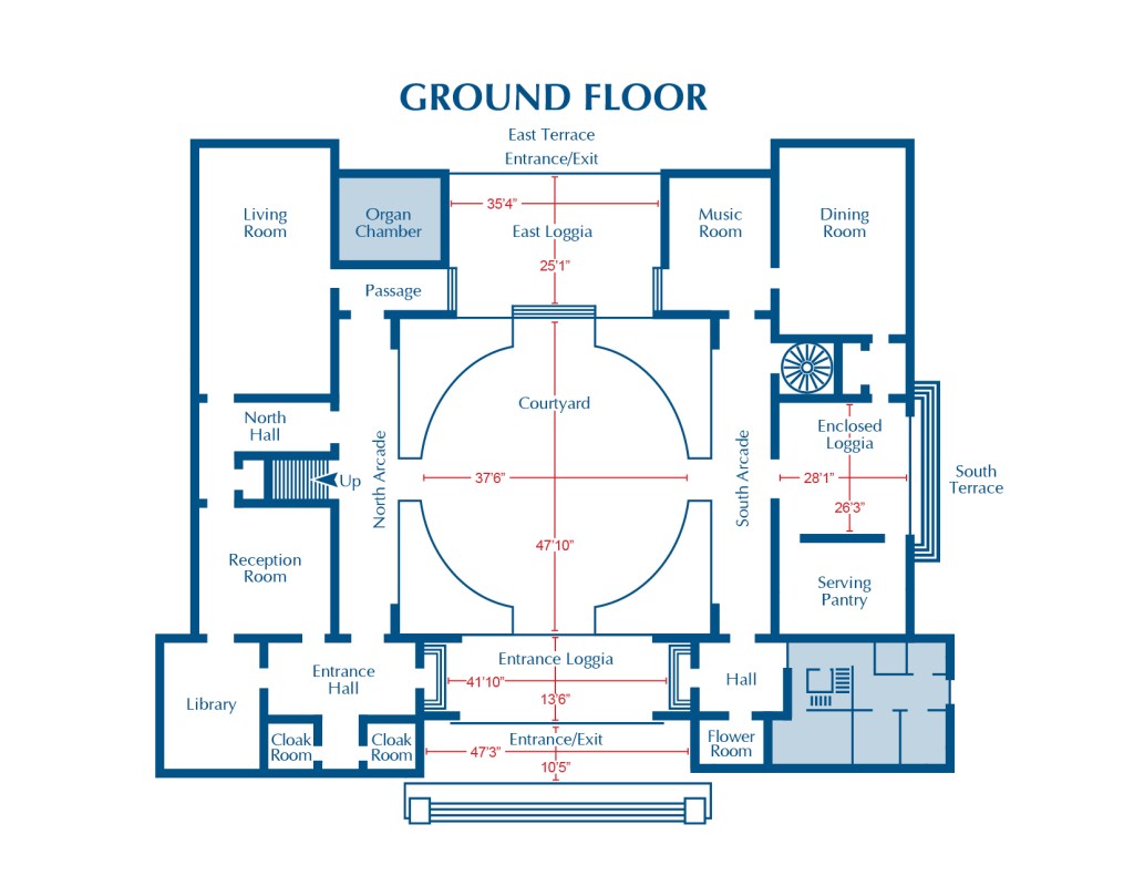 The ground floor features a grand entrance opening into a spacious two-story courtyard. The rooms on this floor include the entrance hall, library, reception room, living room, east veranda, music room, dining room, flower room and serving pantry.