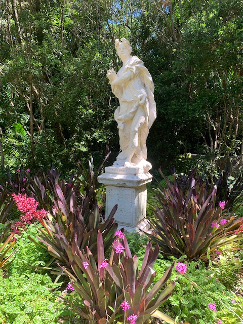 Sculptures from eighteenth century Italian gardens – especially those around Rome – serve as accents in the gardens. New sculptures were also commissioned. The new sculptures were carved from a soft porous coral stone, which made them look weathered almost immediately.