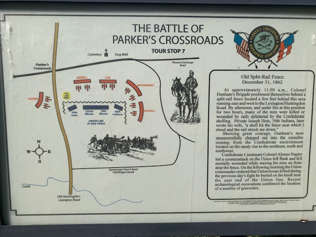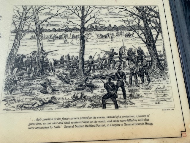 We are now in the Parker’s Crossroads Rv park, for the night, The park is small but nice, see picture below. We left Cave City Ky, this morning and drove 193 miles to get here. Lots of truckers, and i suspect lots more going through Memphis tomorrow. When we got here today , I noticed a sign that said Parker’s Crossroads Battlefield. After we got settled we took a late afternoon, to the visitor center and a very nice almost 2 mile walk on the battlefield. With all my knowledge and being a civil war buff, I had no idea there was a battle here. Interstate 40 runs right through the middle of it. As the interstate was built in the 60’s there was not any of the battlefield land saved. Today they would have to go around the battlefield to put it in. SO, you say what happened here, let me tell you.