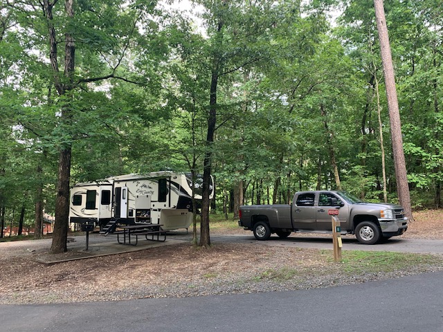 Well sort of, we are at Lake Catherine state park about 15 miles east of Hot Springs. Friday we left Parker’s Crossroads ,and drove 310 miles, to the state park. It was not fun driving through, Memphis and Little rock. We will be visiting Hot Springs National park while here, the park is right in the city, well historic district. The smallest national park there is. The picture below is of our spot, first time I had to back in a spot for well over a year. Melissa said I did good, that’s all that matters