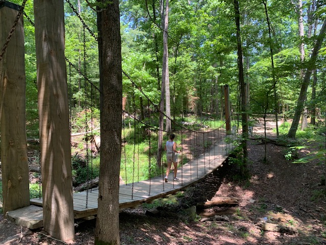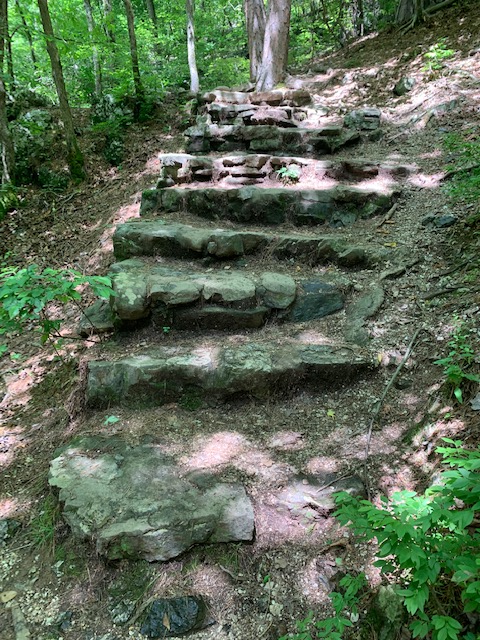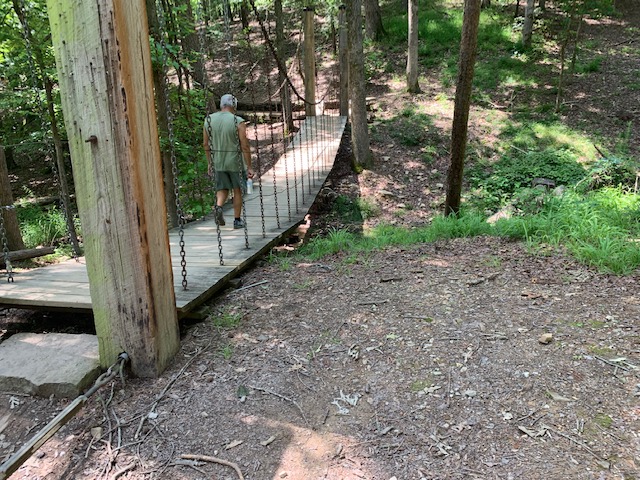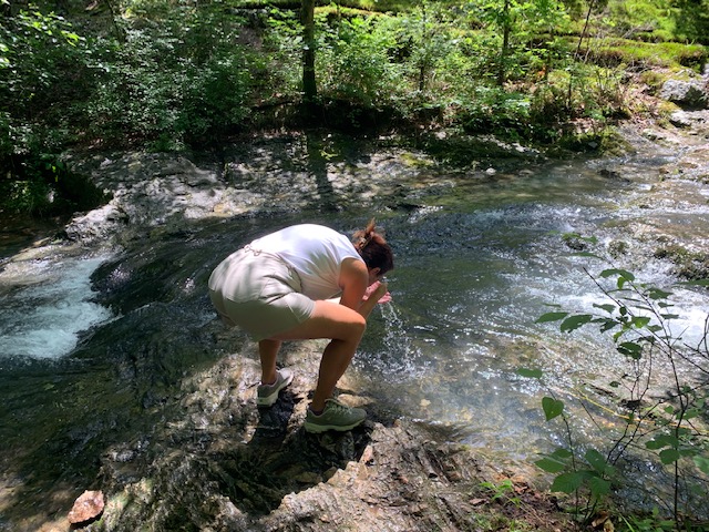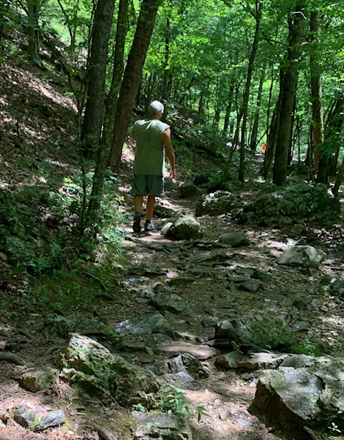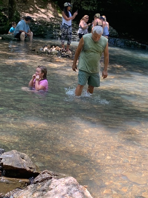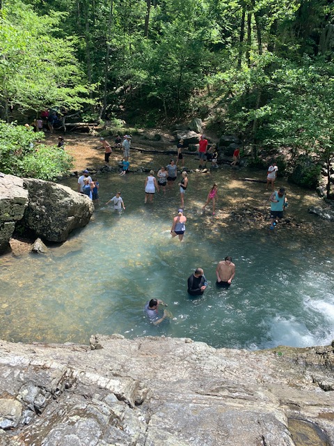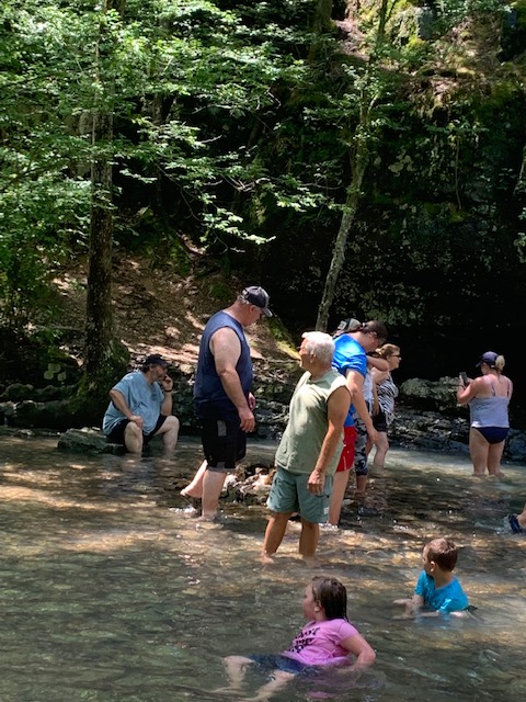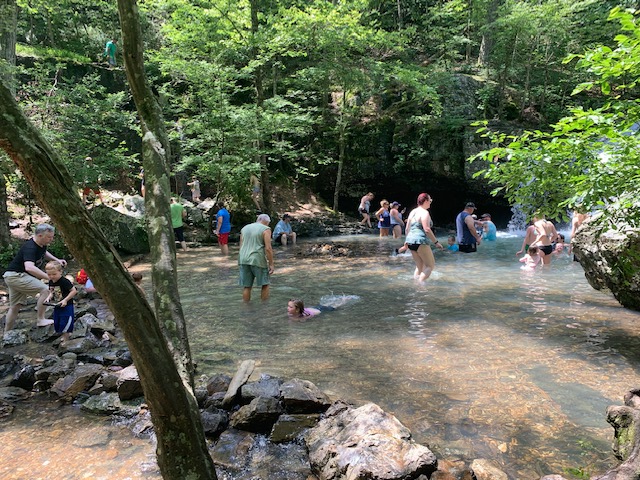 Besides going to Hot Springs I chose this park to stay at for it’s very popular waterfalls. Not a very high one, but the creek that feeds it is very meandering through the woods and has a series of slight falls along it. So in the 110 degree heat today we took the hike to it. It was very nice and filled with people. One thing we did not know was you can go in it by the falls, we were not prepared for that.