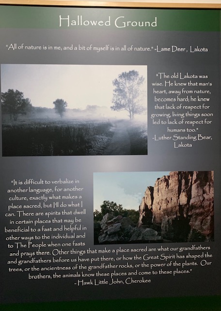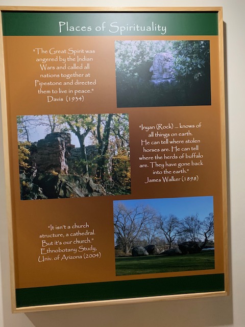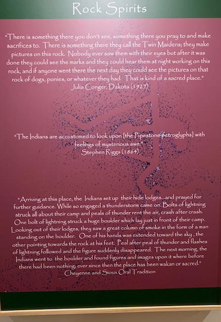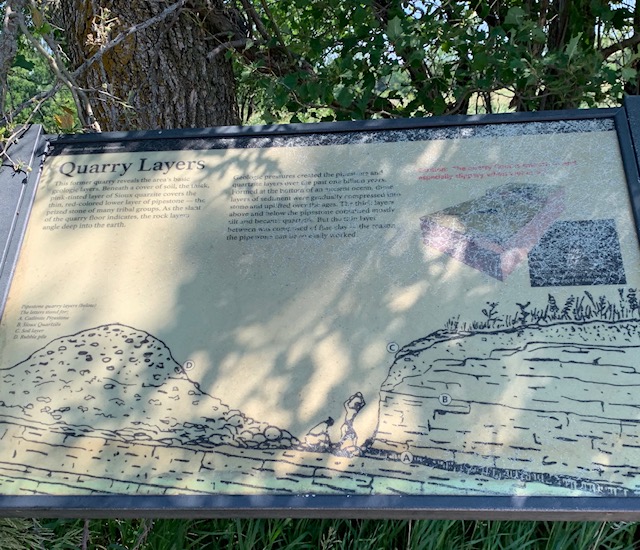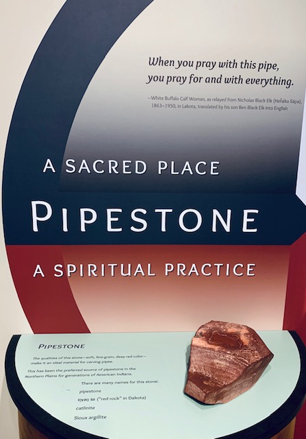 As it turned out . . . . For countless generations, American Indians at this site have dug out the red stone used for the carving of their ritual pipes used in prayer, Peace Pipes As noted in the seminal text of Native American religious beliefs and practices, Black Elk Speaks, “When you pray with this pipe, you pray for and with everything.” The American Indians believed that the smoke from a pipe made a connection to the Great Spirit by carrying prayers aloft. These grounds are sacred to many people. The traditions of quarrying and pipe making continue here today.