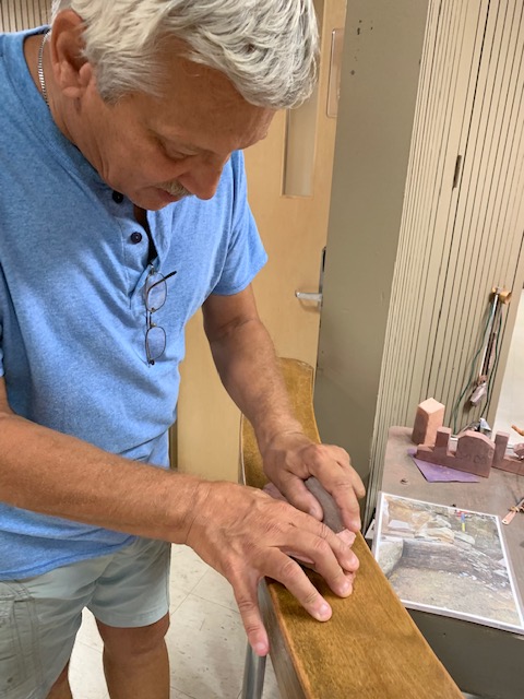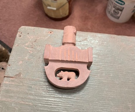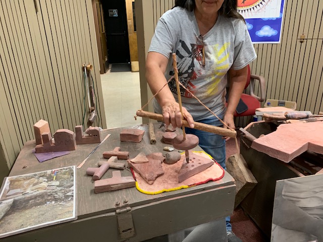 Cindy showing us what they used to make the hole in the pipe. Dave is sanding down, rounding off a piece of pipestone.