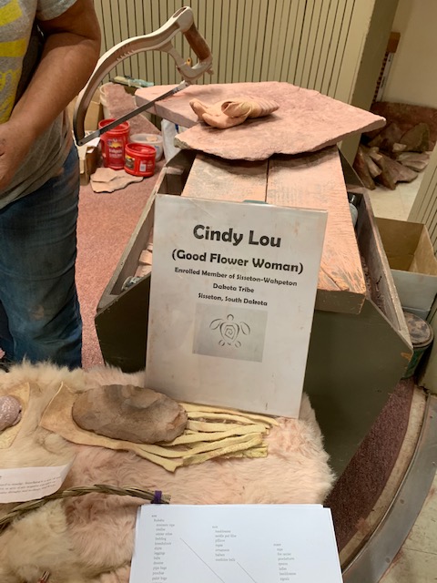 Cindy showing us what they used to make the hole in the pipe. Dave is sanding down, rounding off a piece of pipestone.