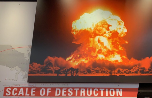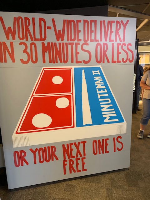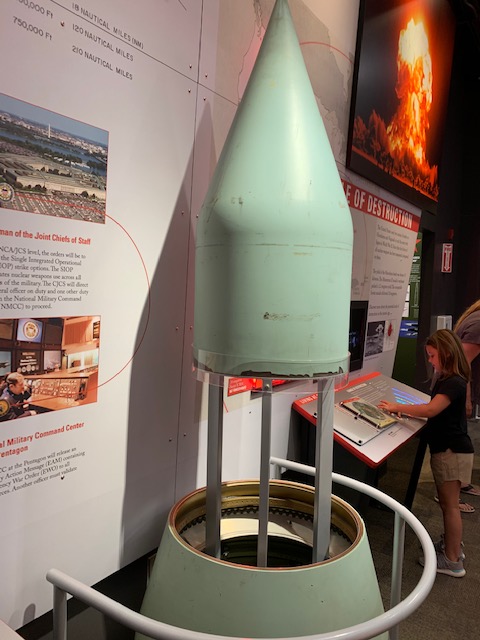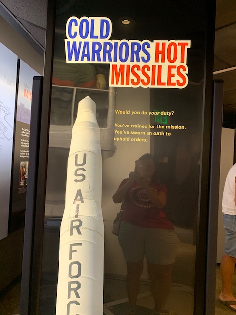 In the plains and wide open spaces of South Dakota, where we are and a few other states out west there lurks a danger hidden in plain sight. Since the late 1950’s there have been over a thousand minuteman missiles hidden in silo’s, ready to be launched at any time. Today we went to the Minuteman Missile National Historic Site. Set up in the early 90’s after a worldwide treaty, between the United States and Russia to reduce it’s missile supply. This was a really eye opening visit, learned a lot and went away with a feeling of how mankind has figured out a way to kill us all. Now there are only about 500 Titan III minuteman missiles around. In Wall, where we are there is one base nearby, with a unassuming house surrounded, by barbed wire, guarded day and night. While below 60 feet in the ground is a launch control room, manned by two people round the clock, waiting. Surrounding them are 10 silo’s each carrying a Titan III, with three, 10 megaton warheads attached, ready to launch, if word came from the president. I don’t like that. We also went to the Delta 9 site, which houses a real Titan II minuteman missile. From the glass dome above you can peer down and view the thunder of death. With it’s solid fuel inside it would only take thirty minutes to travel 5000 miles to it’s intended target. There have been about twelve close calls, the Cuban missile crisis a big one, but one in 1973, when the U. S. radar screens lite up with multiple missiles launched, from Russia, only a few minutes later realizing someone put in a computer tape of a training simulated attack. Also one in 1983 on the Russian side, where the commander was ordered to fire on the U. S. . He disobeyed this order, hesitated and figured out there was a glitch somewhere, and fixed it. He was stripped of his command, and cast aside for his actions in saving the world, go figure.