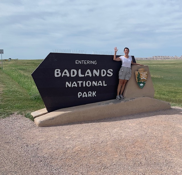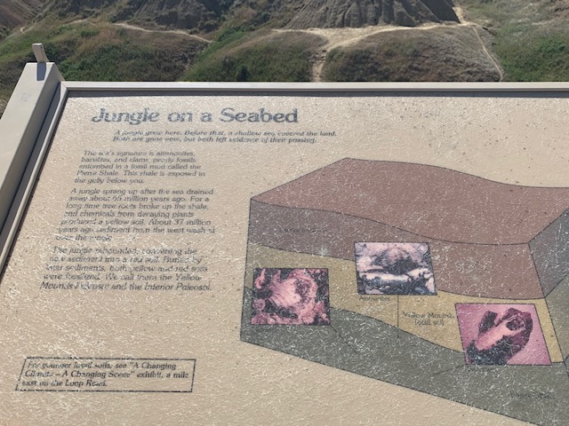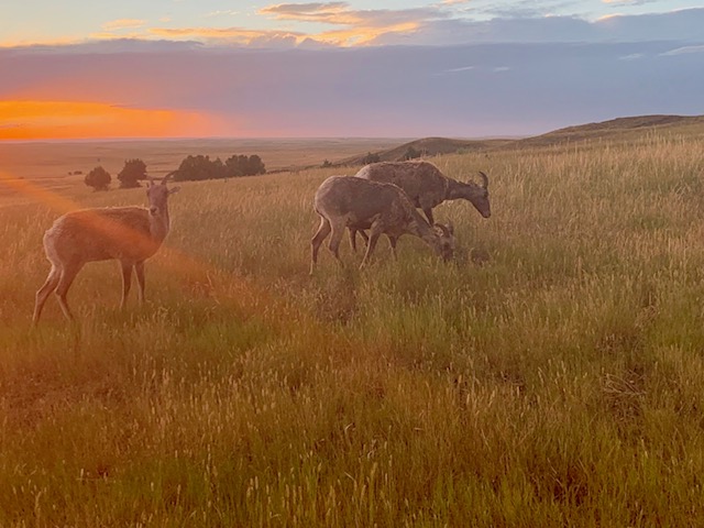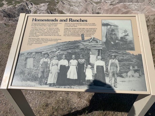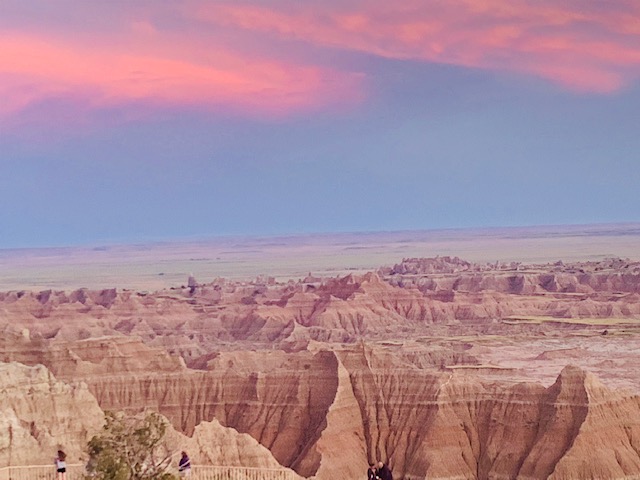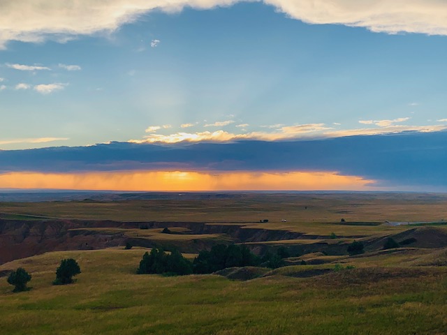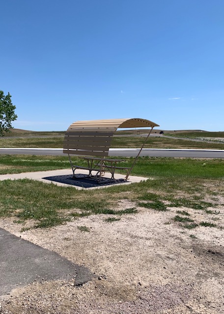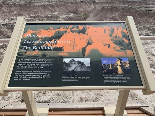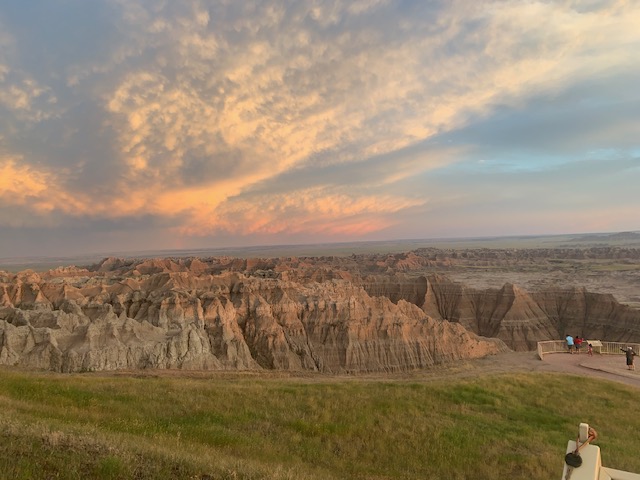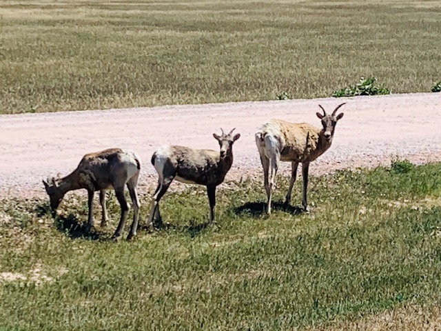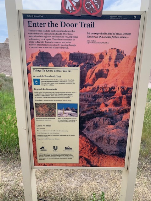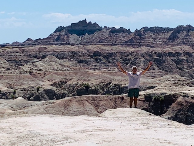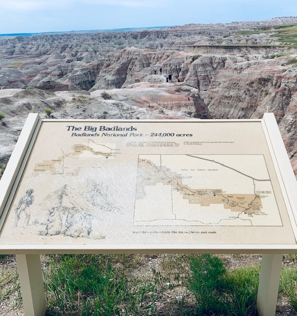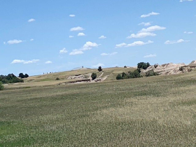 THE BADLANDS or “Mica Sica” as the Lakota Indians named it, was formed over 1million years ago, with uplifts in the earth, volcano eruptions, and massive movement of rock and stone to create an over 60 mile long shelf or wall formation. Around 500,000 years ago water began to cut down through the rock layers, carving fantastic shapes into what once was a flat floodplain. Ancient fossil soils, buried for millions of years, once again were exposed. Erosion, and rain, drive the ever changing landscape as more sediment is washed away. In human terms it will not change, but in another 500,000 years, they will erode away. As we traveled the over 30 mile park roadway, it is hard to grasp what you are seeing, moving, and changing colors of rock in layers all over. Then you come to the plains area, and next to it the plain has eroded into deep gullies, and towering spires all over. As you peer into the depths and prairie lands it just goes on and on. We saw a lot and the pictures don’t even come close to really show what you are seeing. We got to see a Buffalo right along the side of the road, munching on grass. Cooper gave a bark , he looked at us as if to say go away. Then we saw some long horned sheep, and the ever present prairie dog, they are cool. We also saw an active fossil dig site, someone a month ago saw a femur bone sticking up ,and now it is a full scale dig site. They believe there is a full skeleton of the ancient big pig, which stood over six feet tall, that was cool to see. We spent about 11 hours in the park, it was a great adventure.