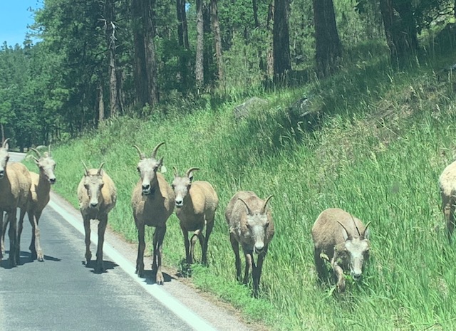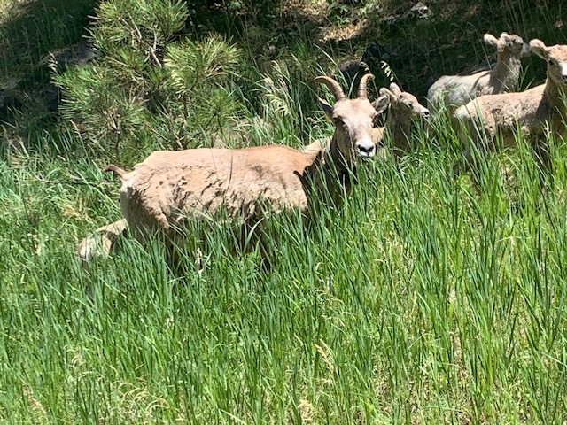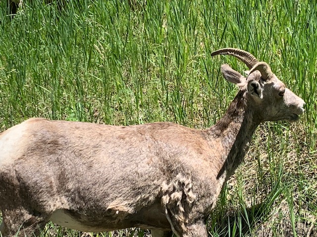 We were driving along and the Big Horn Sheep came from the other direction to say “Hi.”