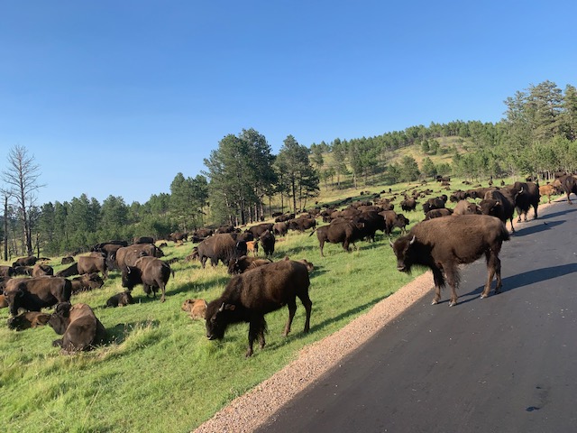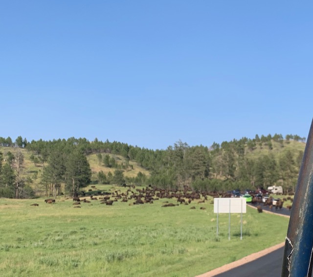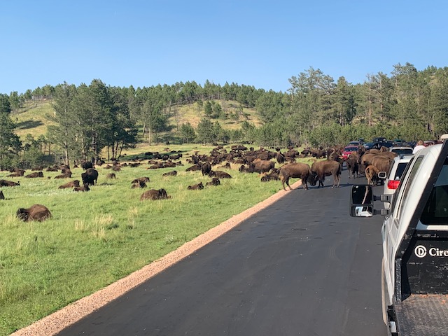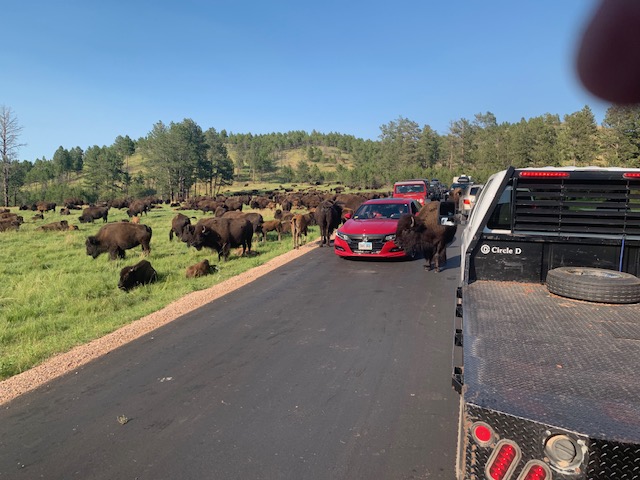 Buffalo! The buffalo herd decided to block the road so we had to wait for them to move out of the way. Keith said this happens about once a year when the buffalo roam. It was a great way to see the buffalo herd all around us. Talk about up close and personal!
