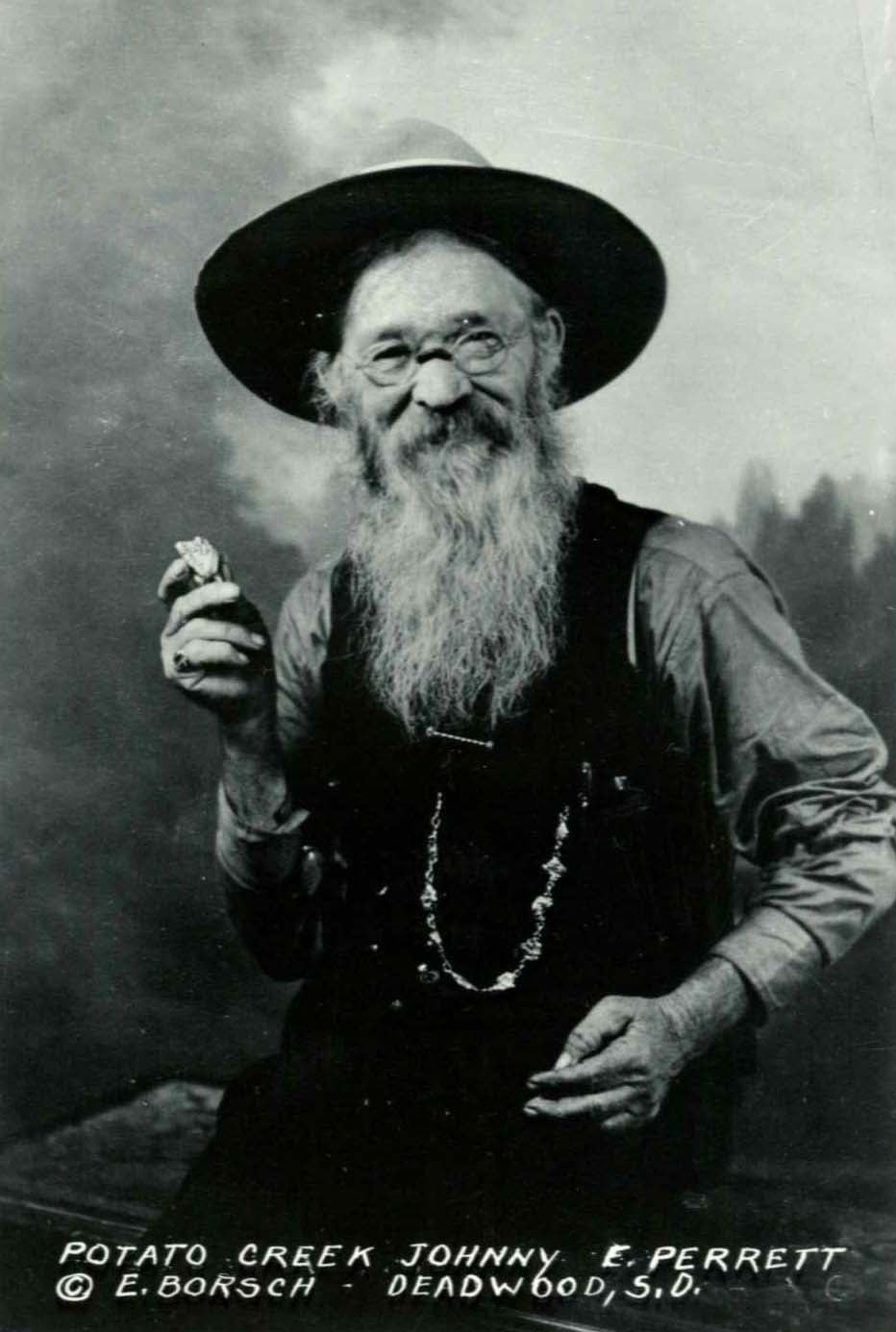John Perrett was panning in Potato Creek when he found a leg-shaped gold nugget. The nugget was reportedly the largest piece of gold ever found in the Black Hills. The lucky prospector became an instant Deadwood legend known as “Potato Creek Johnny.”
