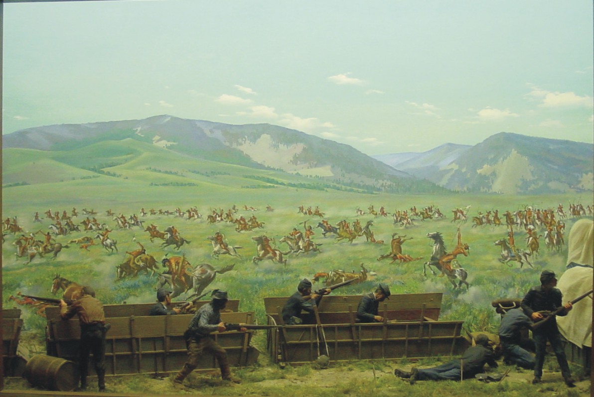 The Bozeman trail, similar to the Oregon trail, was put into use because of the gold discovered, in Montana, so it traveled northwest, unlike the Oregon trail which went west. It branched off the Oregon trail in lower Wyoming and skirted the east side of the Bighorn mountain range, following streams, rivers, low land. All the while being in Crow Indian Territory. For many years, they had no problems with settlers traveling through. Then in the early 1860’s the Sioux Indians came in and pushed the Crow over to the west side of the Bighorn mountains. The Sioux did not follow any treaties and soon settlers were being killed. The U. S. Army then decided to put up a few forts, along the trail, one being Fort Phil Kearny, near present day Sheridan, it was huge, enclosed in the 17 acres of wooden stockade, was everything you could have to run an efficient fort. The fort operated from 1866 to 1868 when the railroad came through and made the Bozeman trail, obsolete. The fort was abandoned and the Sioux burned it to the ground.