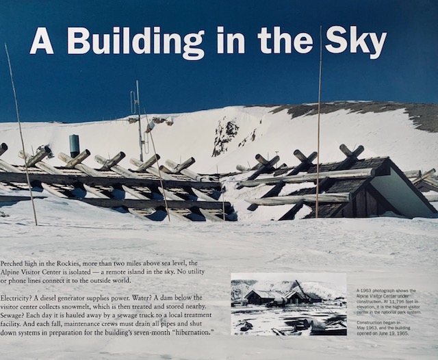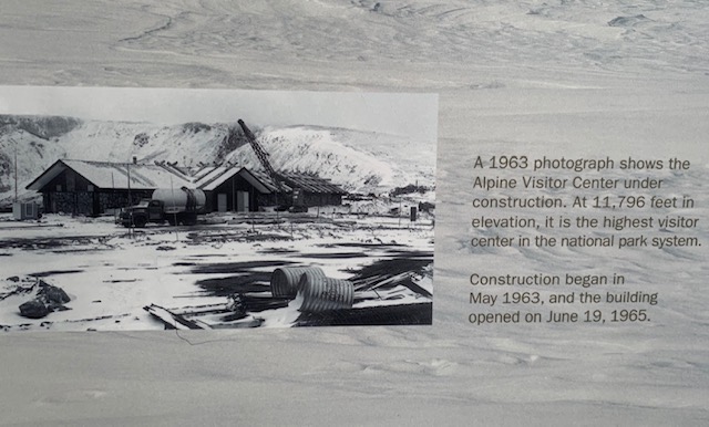 Located at the top of Old Fall River Road Alpine Visitor Center is truly the Visitor Center in the sky. At an altitude of 11,796 feet it is the highest visitor center in the National Park System. It is only open late May through mid-October each year, weather permitting.