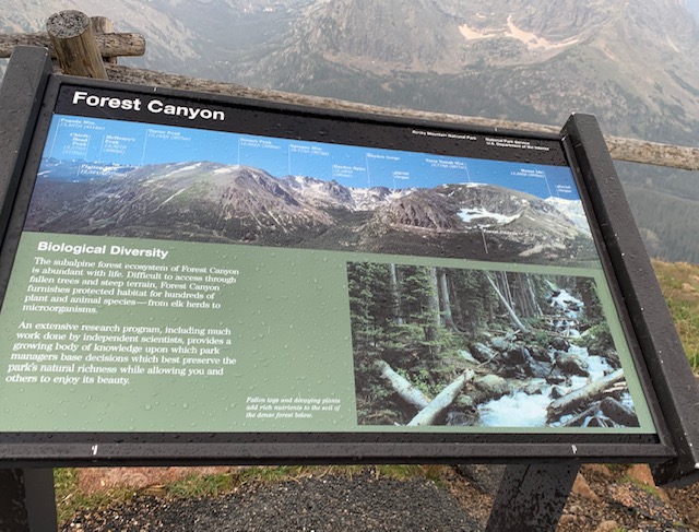 Gore Range Overlook offers views of the Never Summer Mountains, and the Gore Range, with  the flat top of Long’s Peak is in sight – the highest peak at 14,259 feet in the park. You can hike up to the highest peak in the park, but you can’t drive to it.