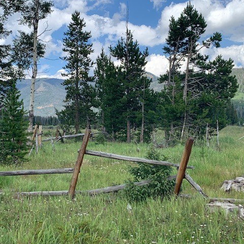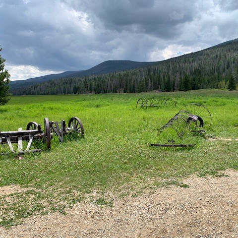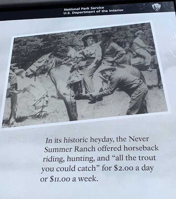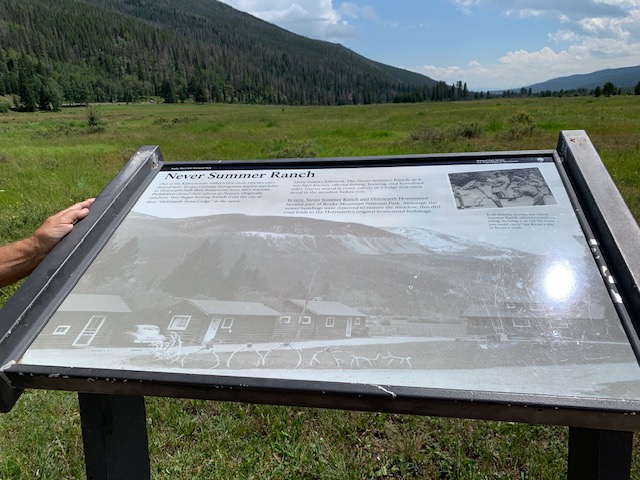 The Never Summer Ranch, as it was later known, offered fishing, hunting, and horseback rides. Guest stayed in rustic cabins or a lodge that once stood in the meadow before you. In 1975, Never Summer Ranch and Holzwarth Homestead became part of Rocky Mountain National Park. Although the newer buildings were removed to restore the meadow, this dirt road leads to the Holzwarth’s or original homestead buildings.