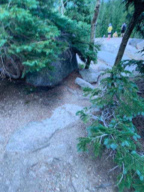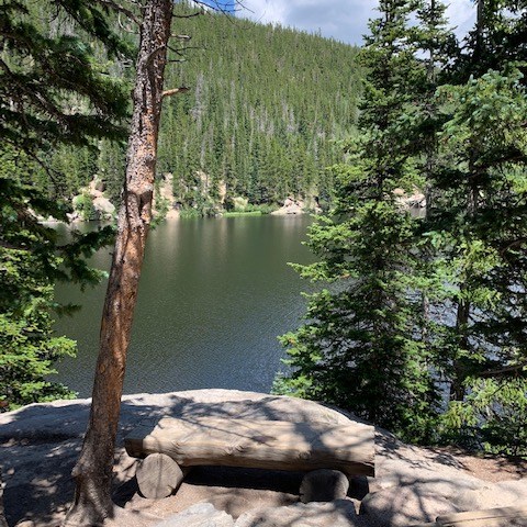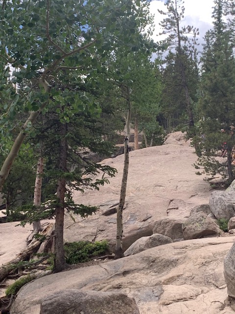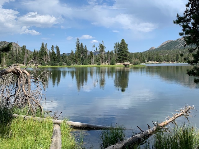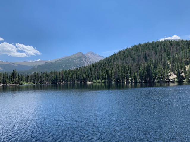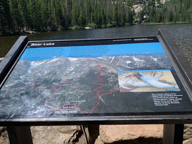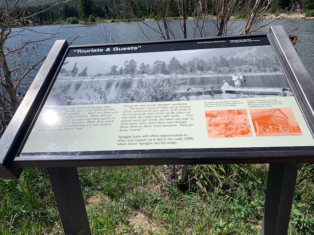 Next we went back to Sprague Lake, where we took the van tour, because we didn’t get to see very much of it. We took a walk which has boardwalks and bridges with views of Flattop Mountain and Hallet Peak.
