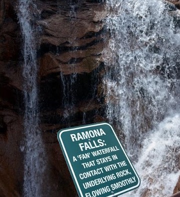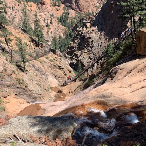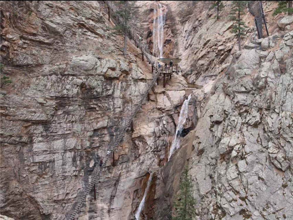 What you see is Seven Falls, a magnificent series of cascading waterfalls located in a 1,400-foot-wall box canyon. Each of the falls have names :Ramona Falls, Feather Falls, Bridal Veil Falls, Shorty Falls, Hull Falls, Weimer Falls, and Hill Falls.