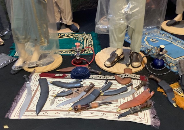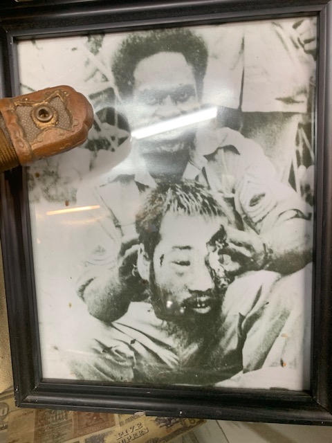 The canisters above are Zyklon B gas used in the death camps. Dragonman has 52 unopened and full canisters. After about 300 people took there showers, they went to the next room, where on top of the roofs, Germans would pour the crystals down the chute. Once exposed to air, they vaporize and within two minutes everyone was dead. in one day they could kill up to 16,000 people using this method. He had these shipped over regular mail in 1990 from another museum in Germany. Try that today. On the right are actual death camp uniforms brought home after the war by survivors. Then donated to the museum.