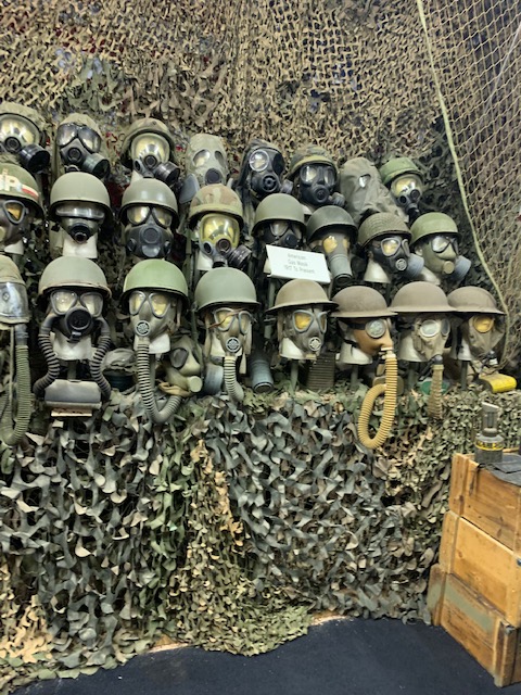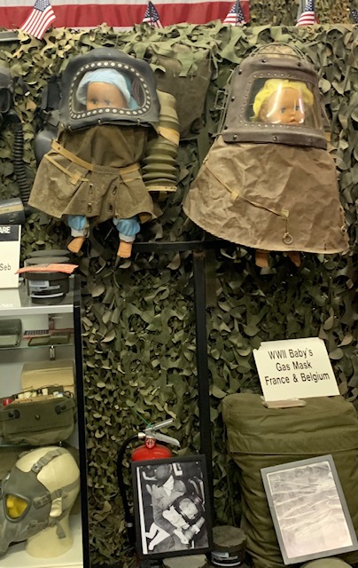 Baby gas masks from Belgium and France during WWII, the whole baby was put inside, these are the only two in any museum in the world. On the right is every gas mask the U. S. has made.