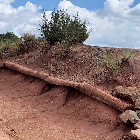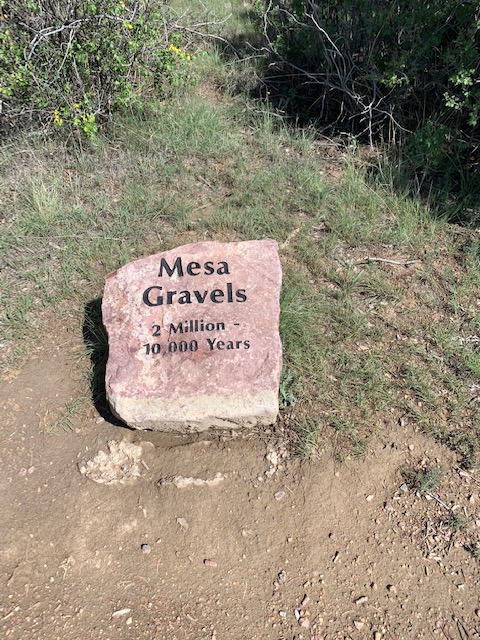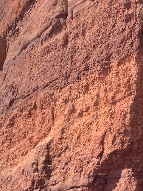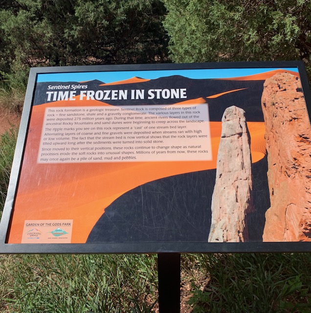 This rock formation, called Sentinel Rock, is a geologic treasure. It is composed of two types of rock – a fine sandstone and a gravelly conglomerate. The various layers in this rock were deposited 275 million years ago. During that time, ancient rivers flowed out of the ancestral Rocky Mountains and sand dunes were beginning to creep across the landscape.