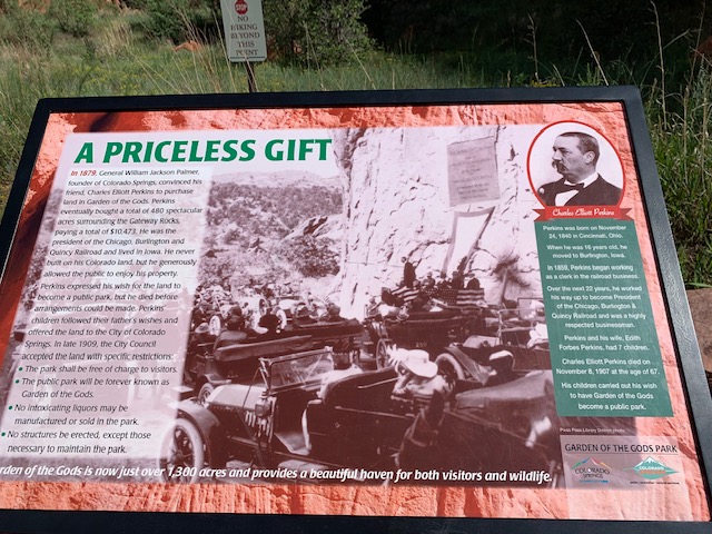 The park was privately-owned until 1909, at which time 480 acres of land that includes the large rock formations was gifted to the city by the children of railroad magnate Charles Elliot Perkins. It was Perkins’ wish that the park be kept forever open and free to the public. Since 1909, other lands around the original 480 acres have been acquired by the city. Currently, the Garden Of The Gods Park is 1320 acres in size.
