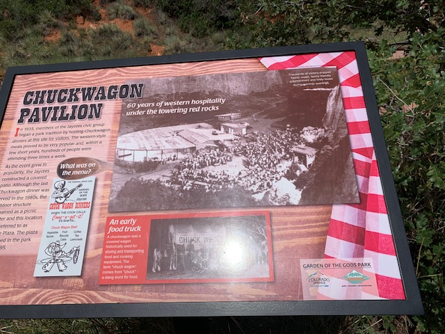 In 1935 a Jaycees civic group began a Garden of the Gods Park tradition by hosting Chuckwagon dinners at this site. The western style suppers proved to be very popular and within a few short years, hundreds of people were attending three times a week. As the event grew in popularity, the Jaycees constructed a covered patio that was soon named the Pavilion. Although the last Chuck Wagon supper was served in the 1980s, the outdoor structure remained as a picnic shelter in the Park until 1995.
