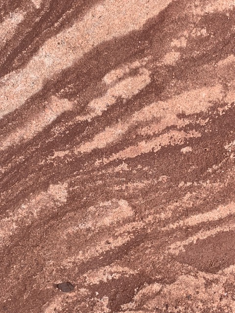 The ripple marks you see on this rock represent a sandstone “cast” of one stream bed layer. Alternating layers of coarse and fine gravels were deposited when streams ran with high or low energy. The fact that the streambed is now vertical shows that the rock layers were tilted upward long after the sediments were turned into solid stone.