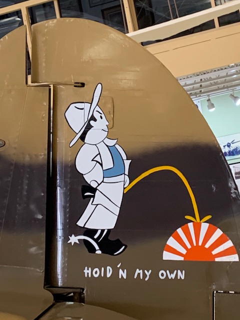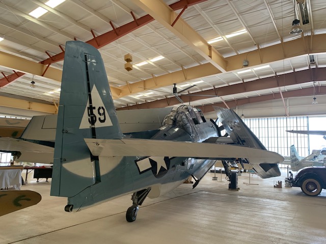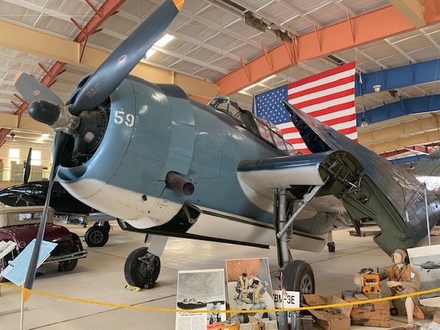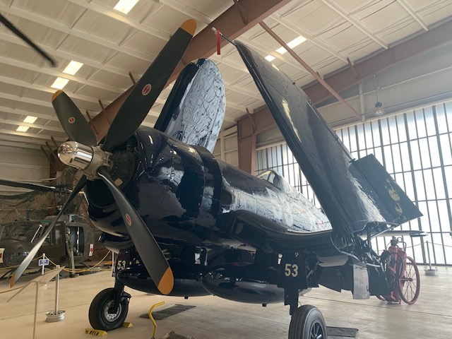This is a P-40 Warhawk, when Japan invaded China in 1939 a few hundred of these were sent over with volunteer pilots, who were paid very well. While pretty fast and nimble, they were no match for the Jap Zero, but soon the pilots devised ways to overcome this by flying in pairs and threes to move in behind the Zero and shoot it down. The emblem on the tail, is not of a Texan peeing on the Jap flag, it is of a Chinaman peeing on the Jap flag. The famed P-51 Mustang, this plane did see combat missions in the war.Here is a F4U Corsair, fighter ,bomber of the marines, this was an aircraft carrier plane. Classic up folded wings, this allowed more aircraft to be put on the carrier. I have not seen one of these before, big and burly, propeller blades are over six feet long. Could go up and meet the enemy or make a bombing run.Viet Nam era F4U Corsair fighter, bomber, what a difference, also carrier based with fold up wings.The Grumman TBF-1 Avenger torpedo bomber. A carrier based plane this one has the back swept folding wings. Three man crew, pilot, navigator, and rear gunner. First saw service in the battle of Midway, all but one was lost, very slow, and had to line up with a ship to launch it’s torpedo. Without fighter escort, the Japanese picked them off easily. This is the plane the first President Bush was a pilot in and was shot down. Another plane I have not seen ,big, bulky and a death trap.