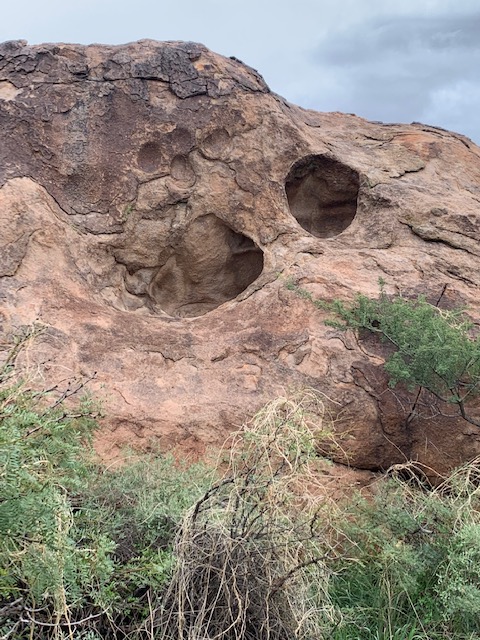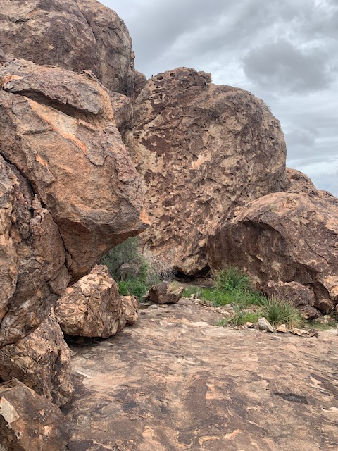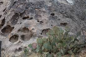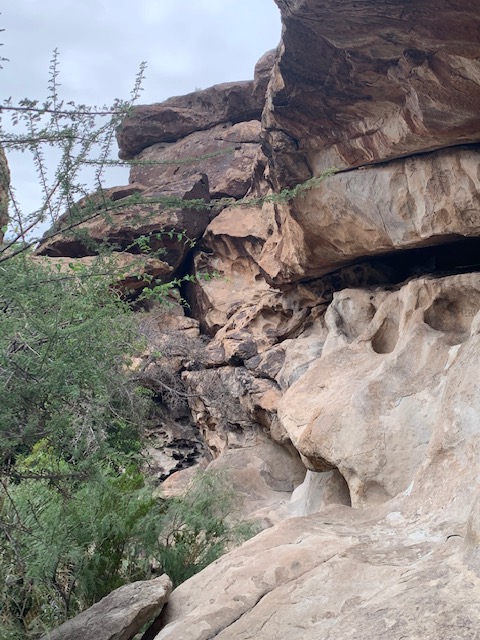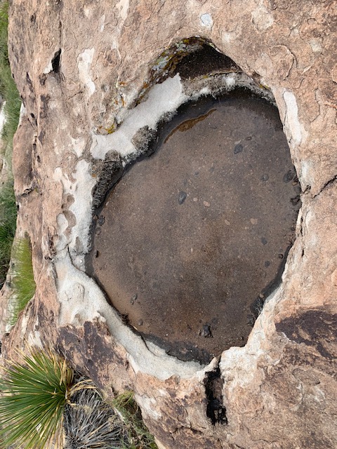 For centuries, ancient peoples were attracted to this area because it provided them with the one essential thing they needed in order to survive in the desert — water! The huge boulders and rocks in the area are pock-marked with fissures and holes, called huecos (whey-coes), that can hold rainwater for months at a time. Hueco is a Spanish word that means hollows, referring to the natural depressions in the boulders. These natural water tanks attracted people and animals and created microhabitats that supported a variety of living things.