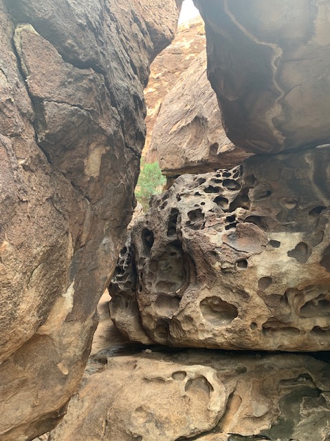 Walking around and exploring you had to go thru some tight squeezes, negotiate loose rock, try not to squash some plant life and even step carefully going up and coming down some moderate slopes and lots of  crevices. It was a fun place to do all of that.