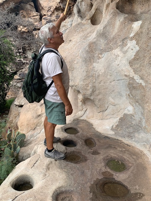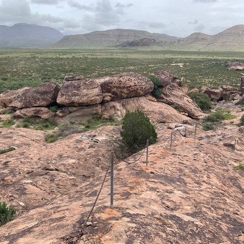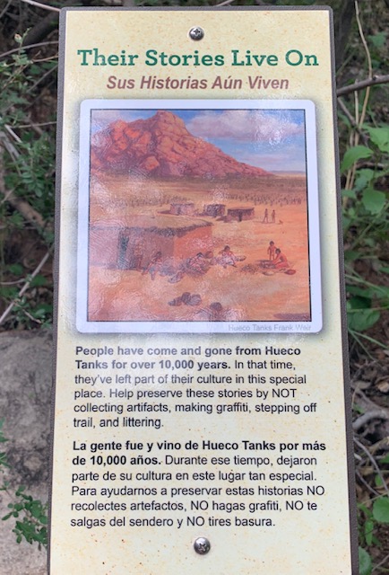 Roughly 10 millennia ago, near the end of the Ice Ages, Hueco Tanks received its first human visitors, small nomadic bands of big-game hunters, who hunted mammoths, mastodons, giant ground sloths, horses and camels of that time. They are called “Paleo hunters, as they left spear points as evidence of their passing. Although it is far from certain, they could have painted the first images – rock art – on the stone surfaces at Hueco Tanks.