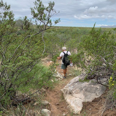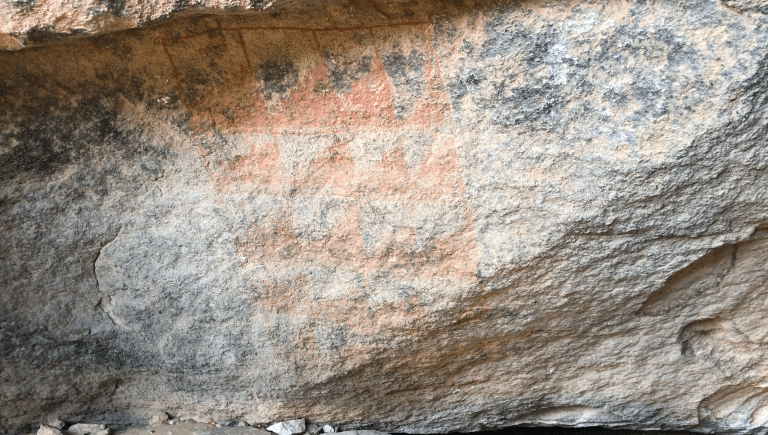 Between ten and two millennia ago, with the Ice Ages ended, the big game extinct and the climate hotter and dryer, Hueco Tanks became a site for the comings and goings of hunters and gatherers – “Desert Archaic peoples” – who took the smaller game and harvested ripening wild plants. More culturally diverse than their Paleo ancestors, they lived in nooks and crannies or in the open desert, leaving behind grinding stones, plant fiber weavings, and bone and lithic artifacts. They painted human figures, hunting scenes and geometric designs on the stone surfaces, leaving the earliest sure evidence of rock art at the site.