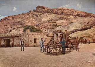 In this painting called “The Humble Way” artist Bob Wygant imagines the Butterfield Overland stagecoach stop at Hueco Tanks. The stop operated from 1858 to 1859 until the stop was moved for more reliable water and protection.