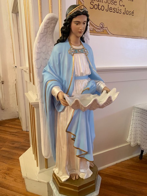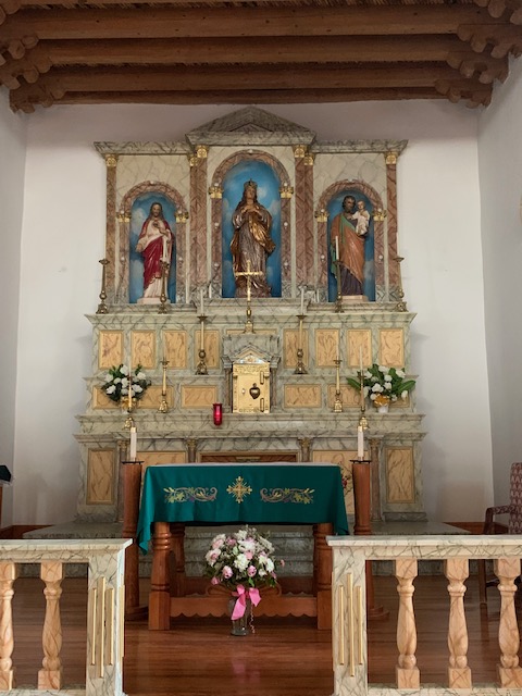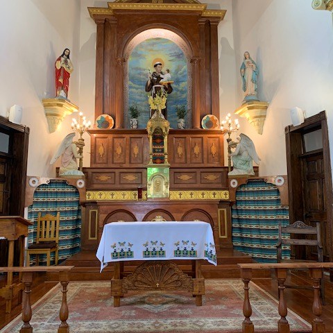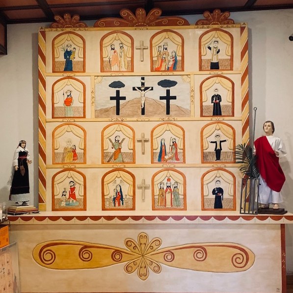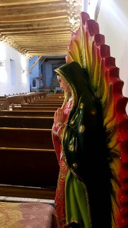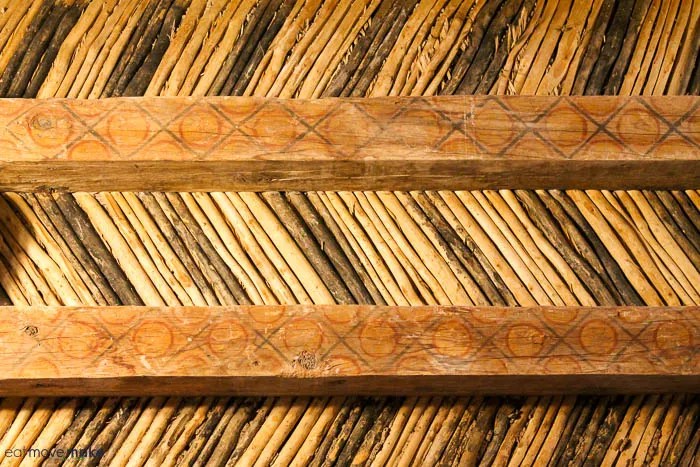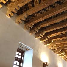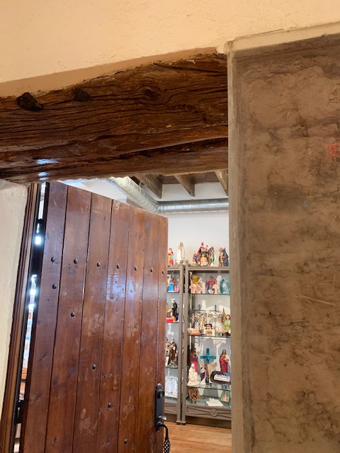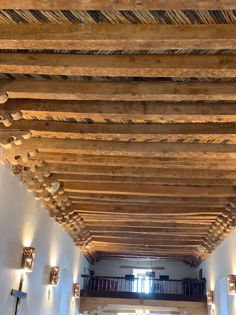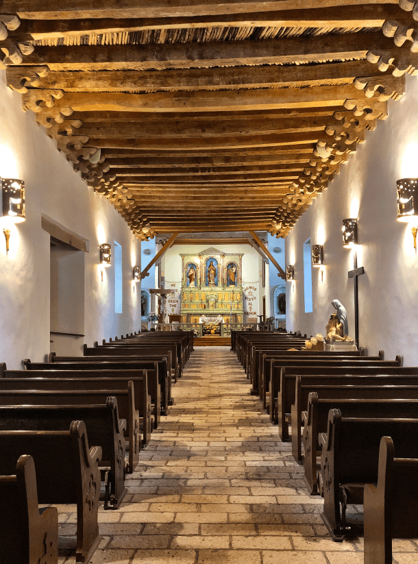 The interior of the church’s ceiling has decorated vigas (wooden beams). The mission was rebuilt in 1843 after the Old Socorro Mission was destroyed by a devastating flood in 1829. The new structure reused the roof support beams and furnishings of the old church. The cross-beams in the ceiling are recognized as the oldest original relics in Texas.