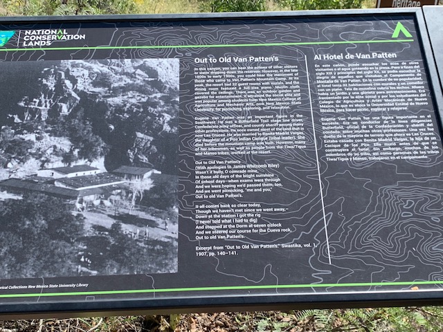 Van Patten, who was from upstate New York, led an exciting life. By the time he opened his mountain resort here, he had been a stagecoach driver, a stationmaster, a county sheriff, a US Marshall, founded several businesses and fought in the Civil War. He was married to a high-ranking Piro Indian woman named Benita Madrid Vargas. He built Van Patten’s Mountain Camp/Resort up here in 1895 and it was finished in 1897.