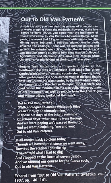 It had 15 guest rooms, a dining hall, a concert hall, a gazebo and a roller-skating rink. The resort, named after its founder and owner Eugene Van Patten, offered guests a refreshing break from the stifling heat of Las Cruces in the desert below. It was all very glamorous and incredibly beautiful and by 1900 Van Patten’s Mountain Camp was the talk of the Southwest. It attracted notables such as Pancho Villa and Sherriff Pat Garrett, known for killing Billy the Kid. Rumor has it that Billy the Kid, who was indeed active in and around Las Cruces, was also a guest. Obviously not at the same time.