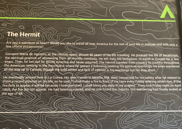 Over the years Hermit’s Peak and it’s sole resident, Juan Maria d’Agostini, have become an important part of the local culture when he came to the area in the 1860s. He was described as a short and thin man with a brown eyes and a gaunt face. He wore a long dark cape and leaned on a walking staff. The local residents had never seen anyone so striking and mysterious. They called him “El Ermitano”, the Hermit.